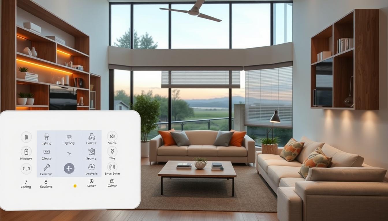 a detailed, high-quality illustration of a modern smart home interior, featuring a sleek and minimalist design with clean lines, warm lighting, and a cohesive color palette. The foreground showcases various smart home devices and technologies, such as a voice-controlled digital assistant, a smart thermostat, and a tablet interface controlling home automation. The middle ground depicts a comfortable living room with minimalist furniture, large windows, and integrated smart lighting. The background features a subtle, blurred view of a connected outdoor space, emphasizing the seamless integration of the smart home with its surroundings. The overall scene conveys a sense of efficiency, comfort, and technological sophistication, reflecting the concept of an accessible, budget-friendly smart home system.